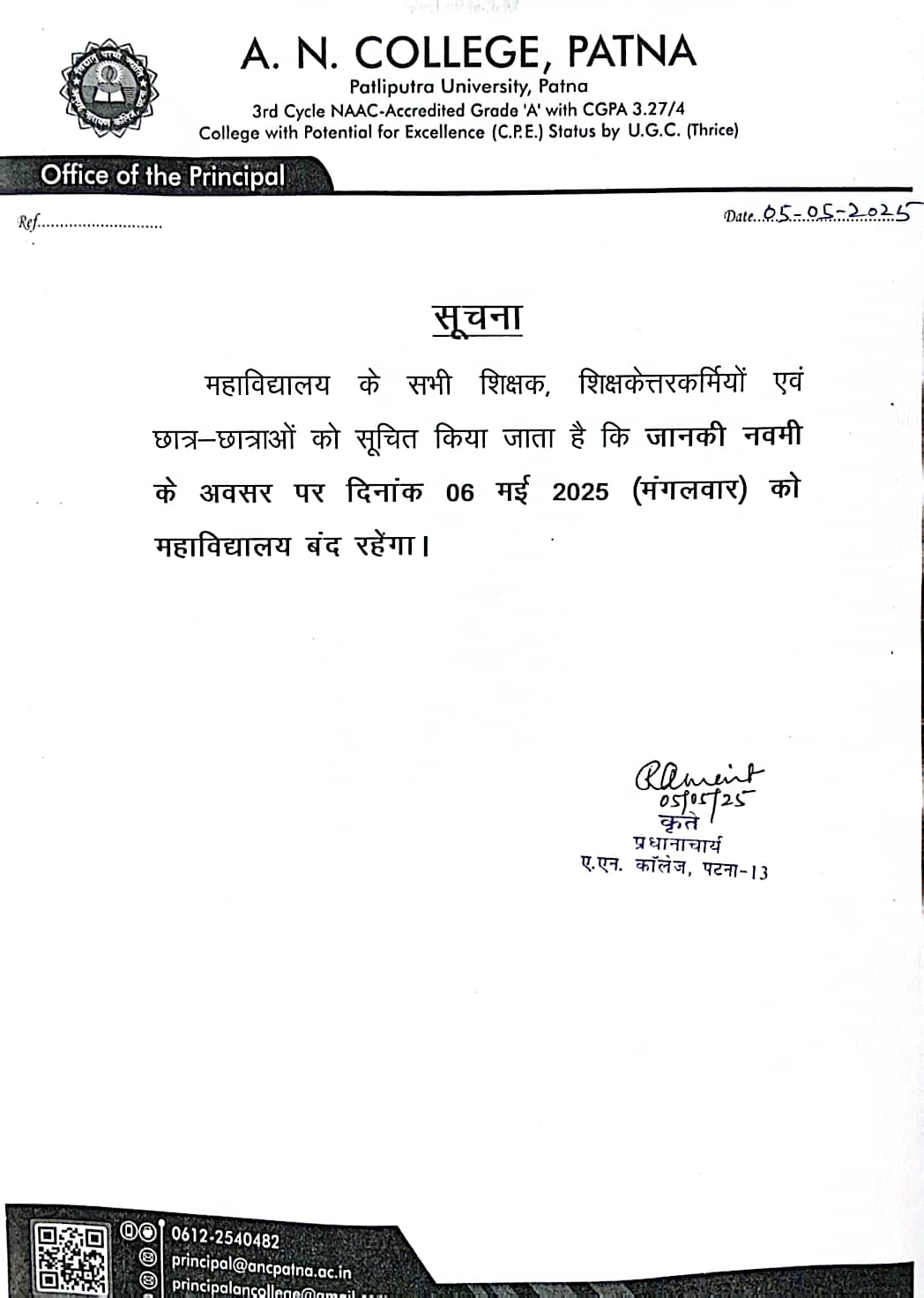 All the teachers, non-teaching staff and students of the college are informed that the college will remain closed on 06 May 2025 (Tuesday) on the occasion of Janaki Navami.