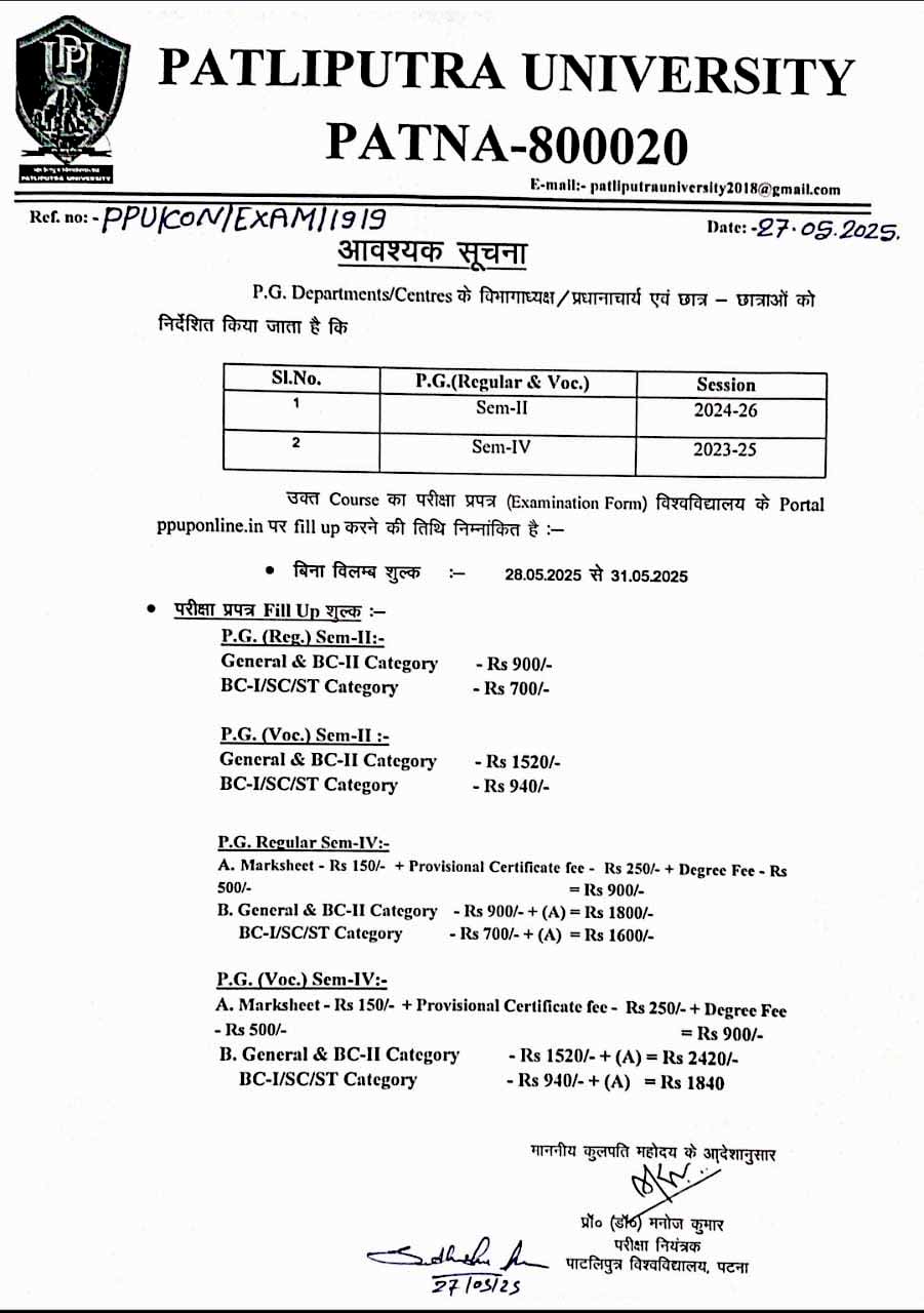 PPU-CON-EXAM-1919, Dated 27-05-2025, Regarding filling the examination form for PG (Regular & Vocational) session 2024-26 semester-II and session 2023-25 ​​semester-IV on the PPU'S University portal from 28-05-2025 to 31-05-2025 without late fee