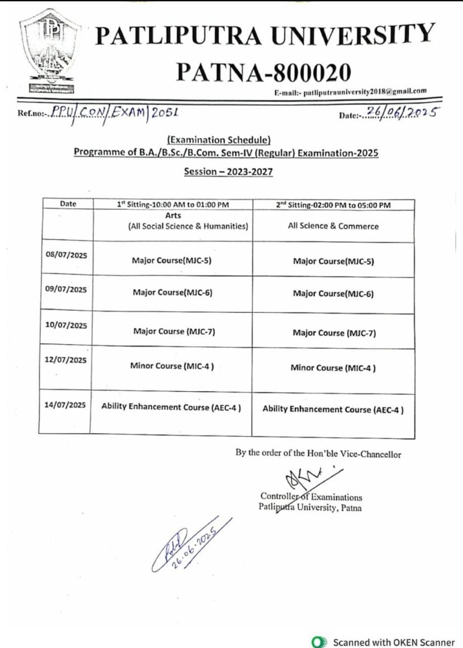 Ref.no. PPU/CON EXAM 2051 Examination Schedule, Programme of B.A./B.Sc./B.Com. Sem-IV (Regular) Examination-2025 Session-2023-2027