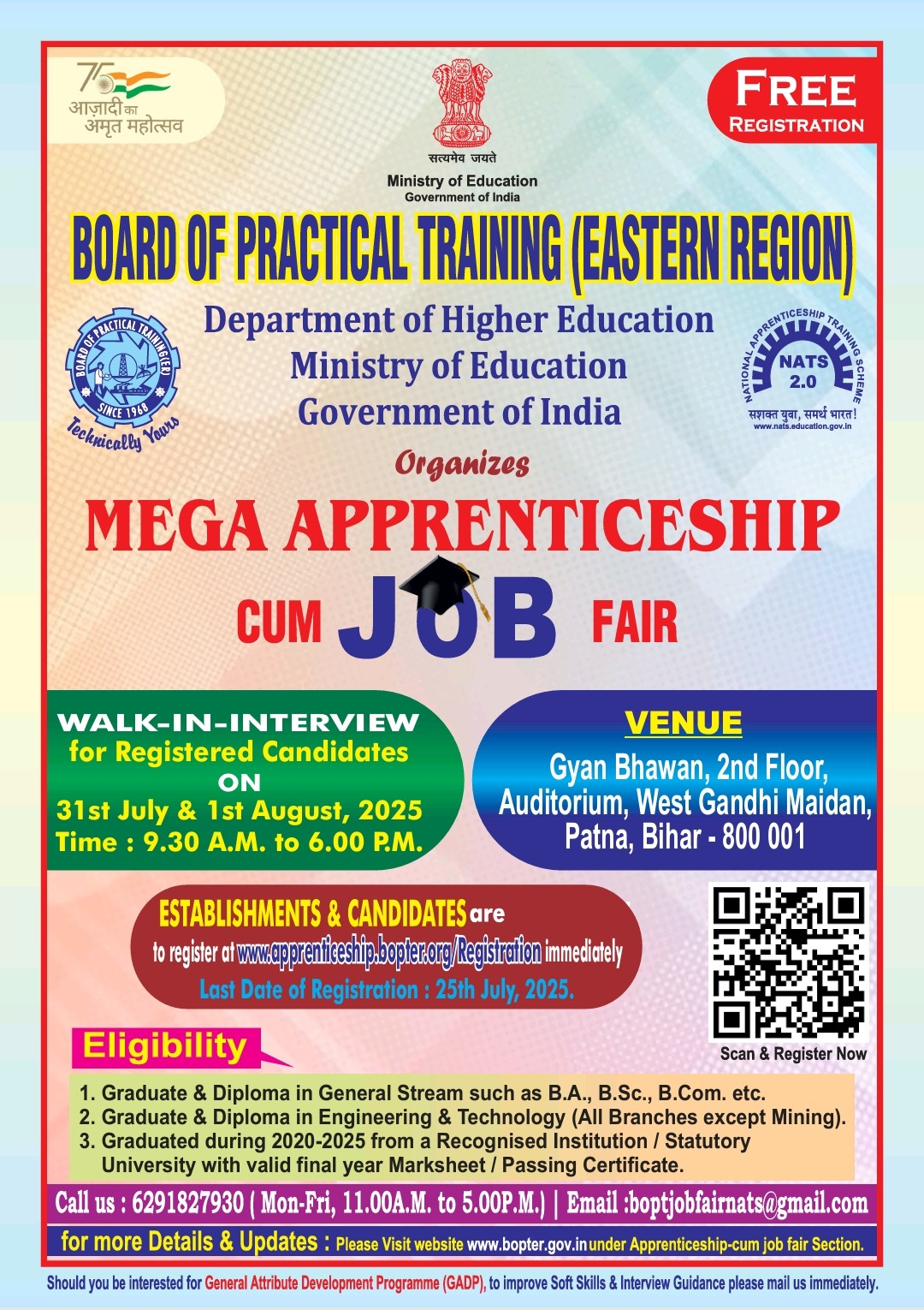 BOARD OF PRACTICAL TRAINING (EASTERN REGION) RACTICAL TRAIN/NGO 02 SINCE 1968 Technically Yours Department of Higher Education Ministry of Education Government of India Organizes MEGA APPRENTICESHIP CUM JOB FAIR WALK-IN-INTERVIEW