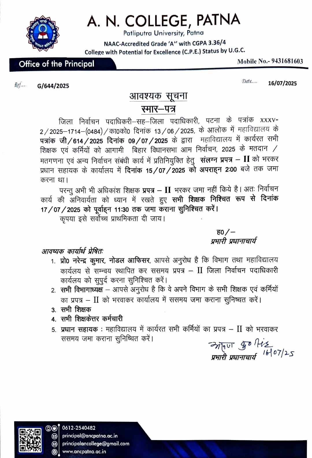 Regarding filling up of deputation forms for all the teachers and employees working in the college in the upcoming Bihar Legislative Assembly General Elections, 2025 by the letter number of District Election Officer-cum-District Officer, Patna.
