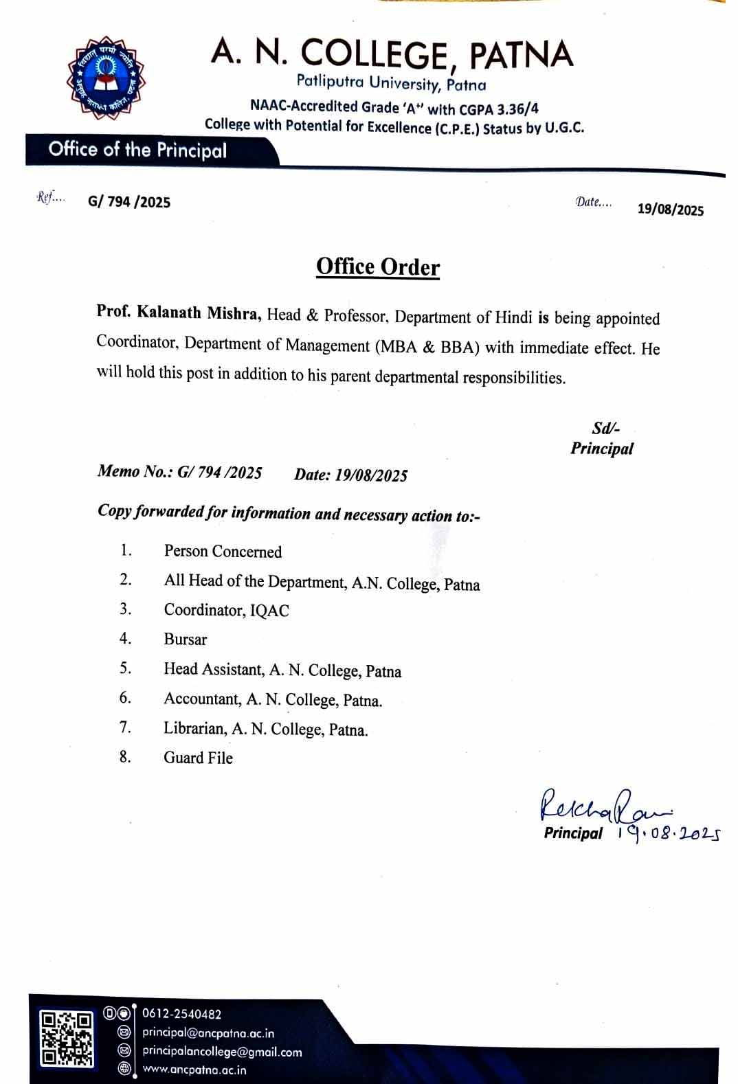 G/794/2025 Prof. Kalanath Mishra, Head & Professor, Department of Hindi is being appointed Coordinator, Department of Management (MBA & BBA) with immediate effect. He will hold this post in addition to his parent departmental responsibilities.