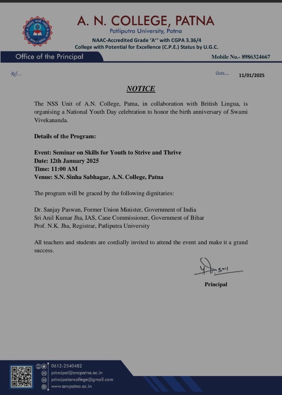NSS Unit of A.N.College, Patna, in collaboration with Pratham Blod Center, is organizing a Blood Donation Camp on 29th March 2025