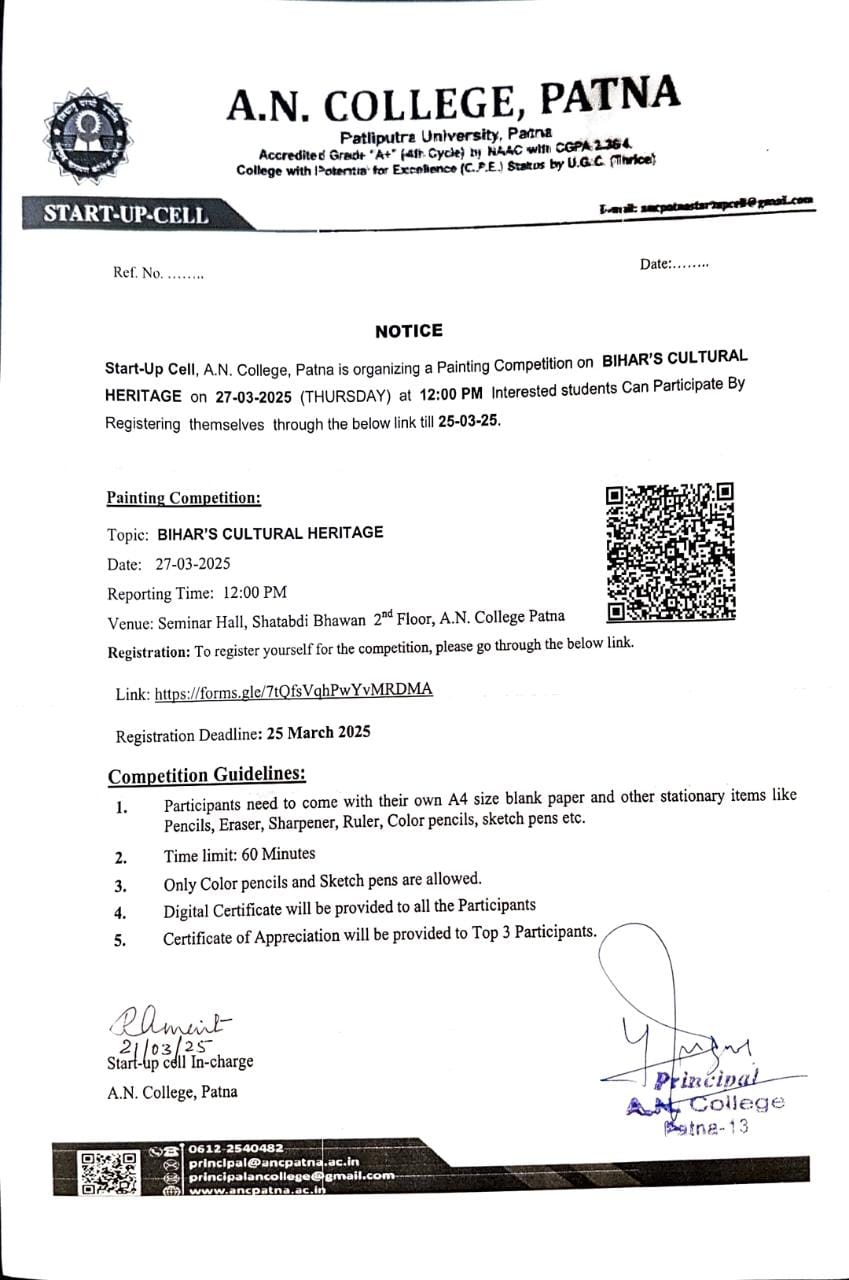 Start-Up Cell, A.N. College, Patna is organizing a Painting Competition on BIHAR'S CULTURAL ERITAGE on 27-03-2025 (THURSDAY) at 12:00 PM Interested students Can Participate By registering themselves through the below link till 25-03-25.