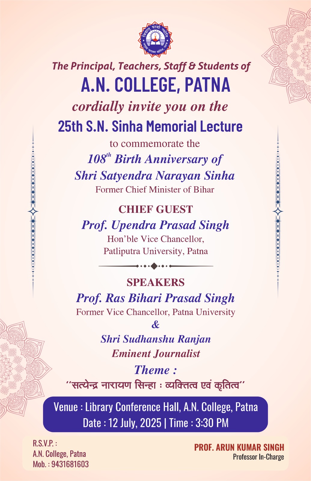 On the occasion of the 108th birth anniversary of Satyendra Narayan Sinha, the 25th S.N. Sinha Memorial Lecture series on the topic "Satyendra Narayan Sinha: Personality and Works" is being organized on 12 July 2025 at 03:30 pm in the Library Auditor