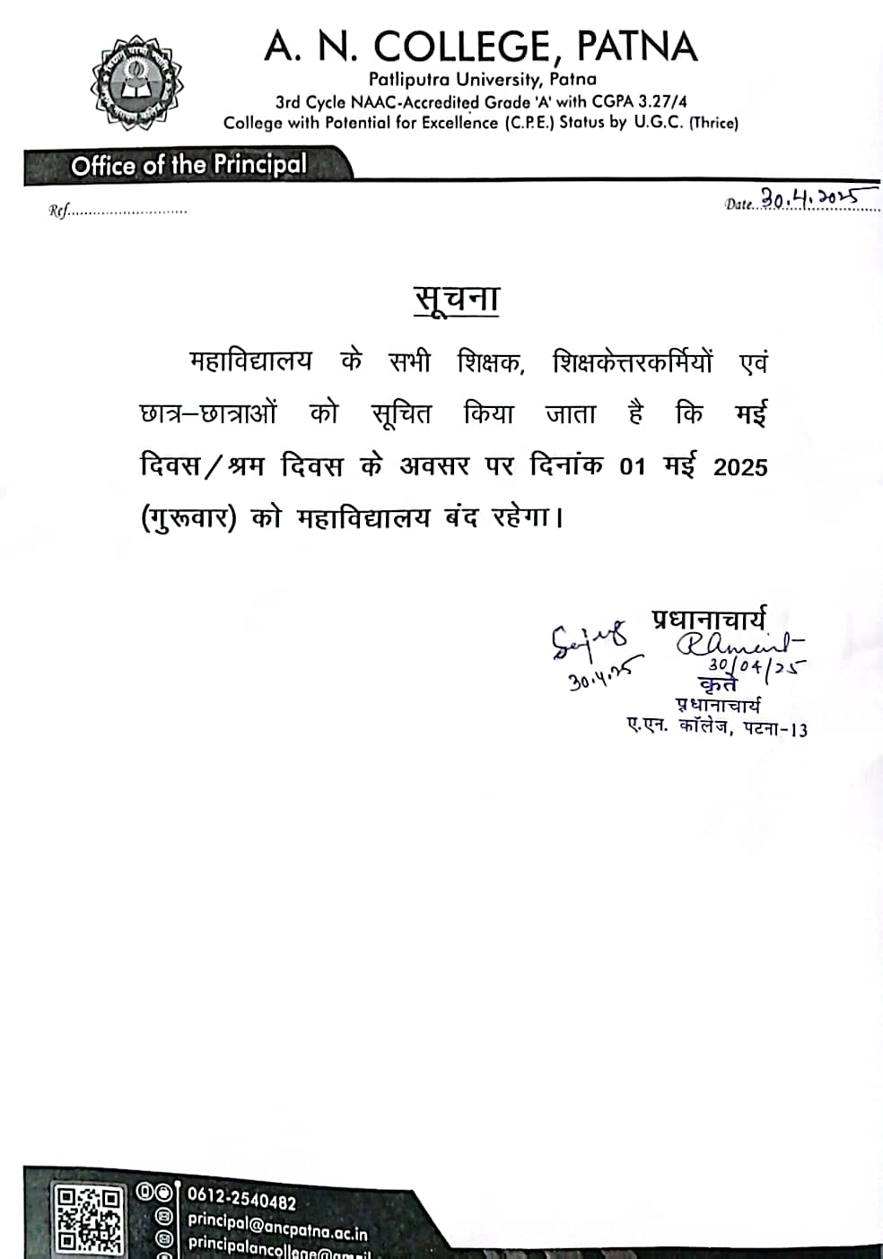 All the teachers, non-teaching staff and students of the college are informed that the college will remain closed on 01 May 2025 (Thursday) on the occasion of May Day / Labor Day.