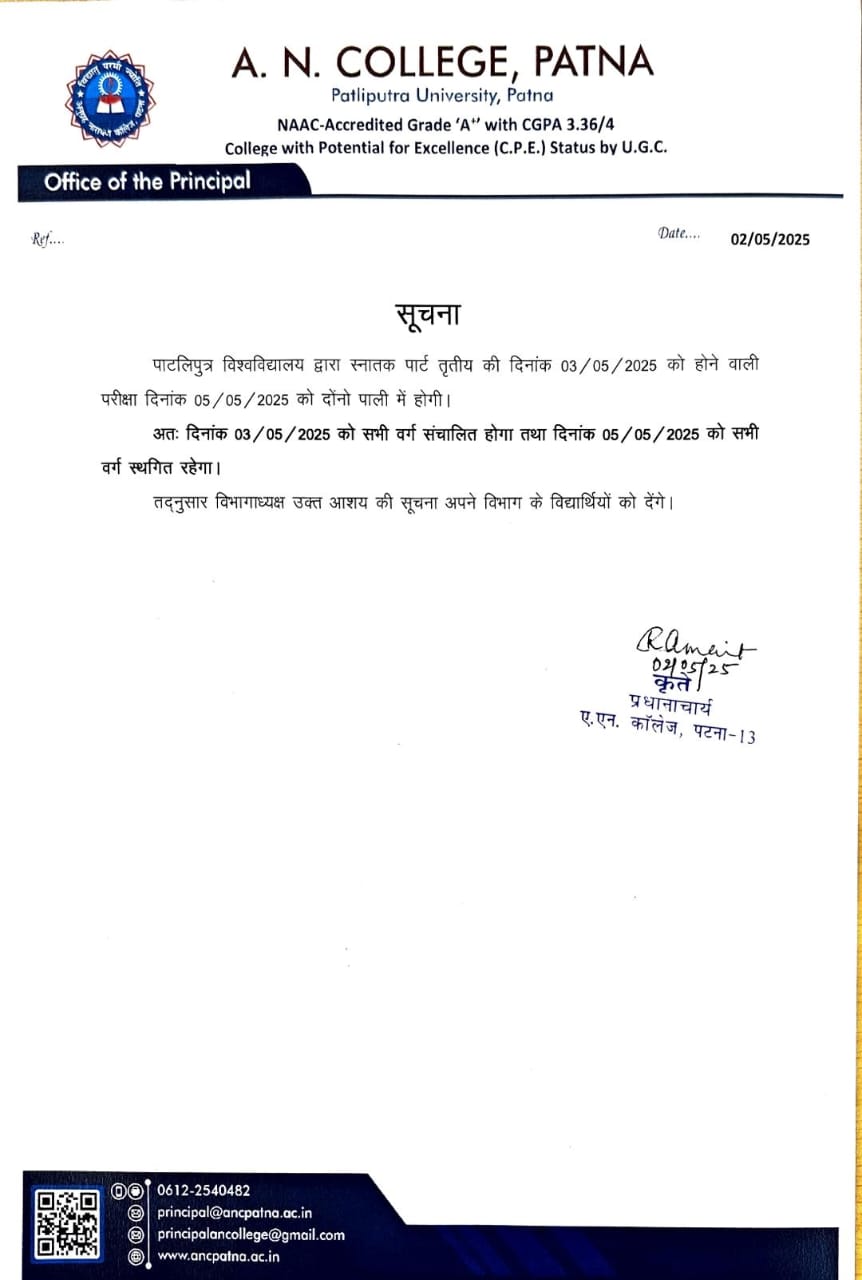 The examination of Graduation Part III to be held on 03/05/2025 by Patliputra University will be held on 05/05/2025 in both the shifts. Hence, all classes will be conducted on 03/05/2025 and all classes will be postponed on 05/05/2025.