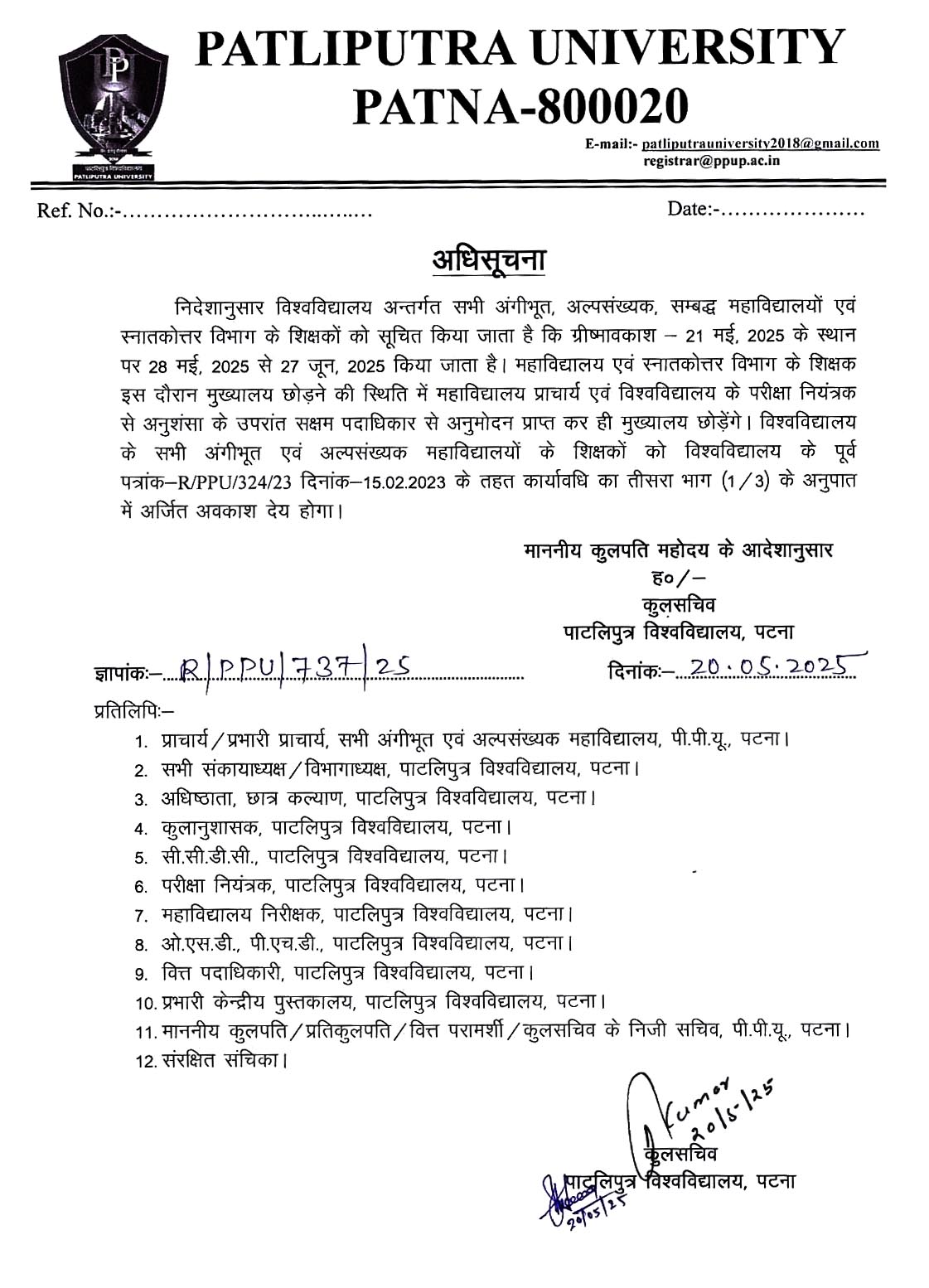 As per the instructions, teachers of all constituent, minority, affiliated colleges and postgraduate departments under the university are informed that the summer vacation is from 28 May 2025 to 27 June 2025 instead of 21 May 2025.